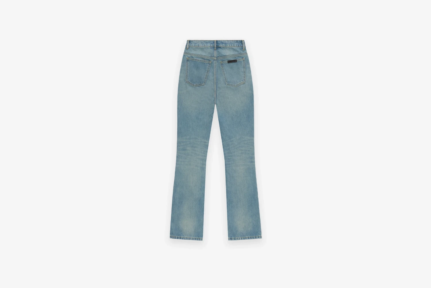 The Womens High Waisted Fitted Jean is made of 100% cotton denim in a vintage blue wash. The high waisted style has a slim leg and is detailed with antique brass hardware, and the Essentials Fear of God black bar.