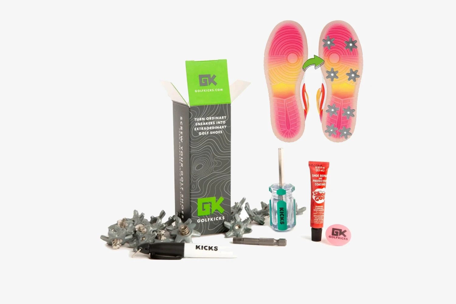 Golfkicks® V5 Traction Kit – transform sneakers into golf shoes.
